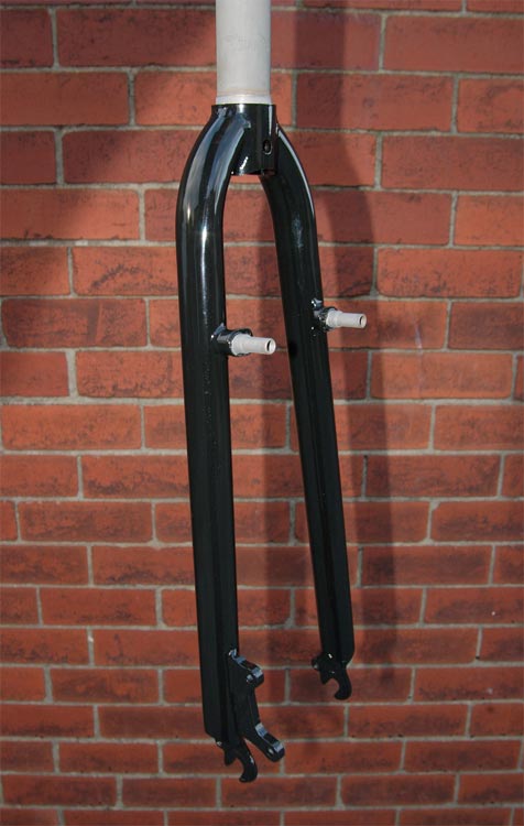 We've actually never experienced any trouble with this on our mountain bikes, but during prototype testing of the ROADHOG fork - which had the disc mount in the usual left rear position - we did actually experience some axle movement. Nothing actually came undone, but after some serious downhill braking on fast roads, the rotors would be rubbing a touch and the wheel would 'clunk' home in the dropout when we undid the axle nuts. This was clearly unacceptable, so we set about finding a solution. Our first port of call was forward facing dropouts, but these would have required custom cut version which would have increased the fork cost disproportionately. Therefore the design problem became how to contain the disc forces whilst using an off the shelf vertical dropout. The solution, as you can see, was to place the disc mounting on the front. This puts all the forces into the dropout, and is still a completely normal International Standard setup, so it takes any IS caliper. It also gets the brake away from the back of the fork which brings us to....