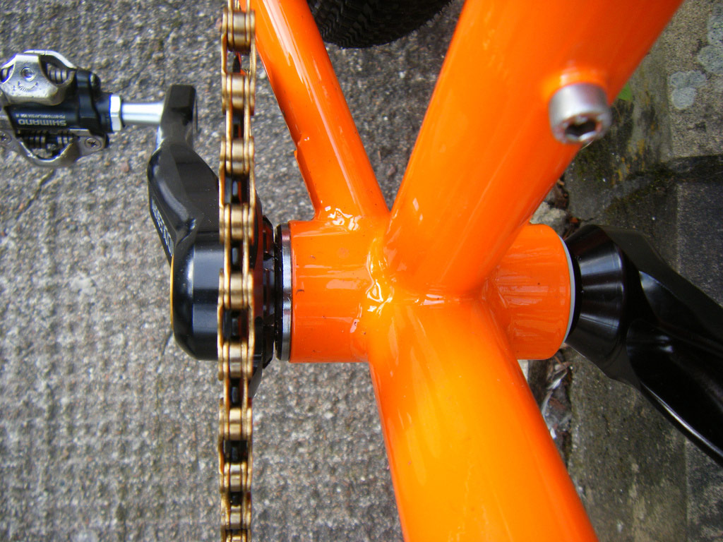 The current solution: Nice, light, stiff seat tube welded directly the bottom bracket in the conventional way. Conventional high band front mech BUT with the redundant bottom pull lever arm cut off to give the requisite tyre clearance. Frame is light, stiff, easy to make. Requires existing front mech to be modified. Very easy to do, and we would offer to do it for people who didn't feel confident to do it themselves. A couple of photos below showing the current design.