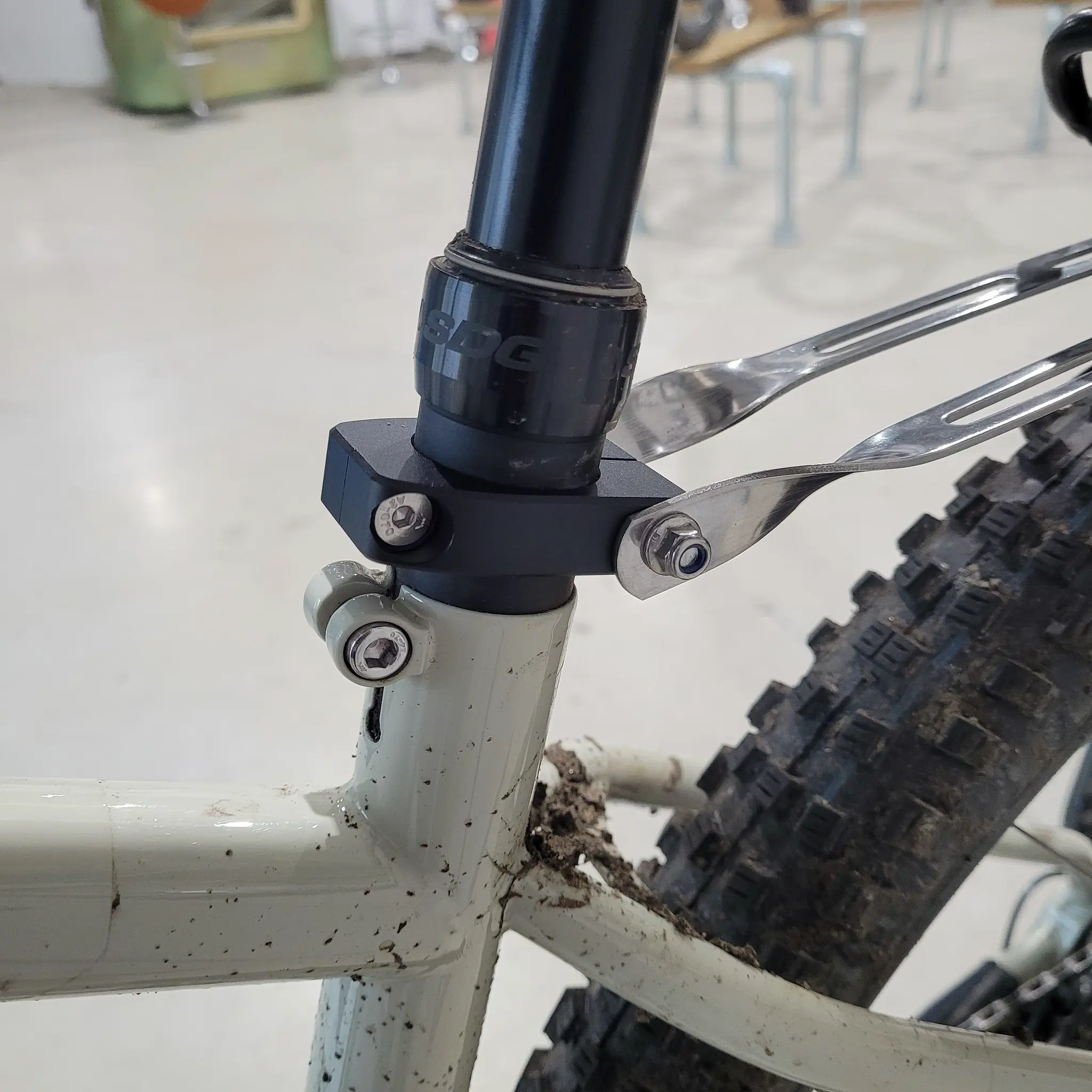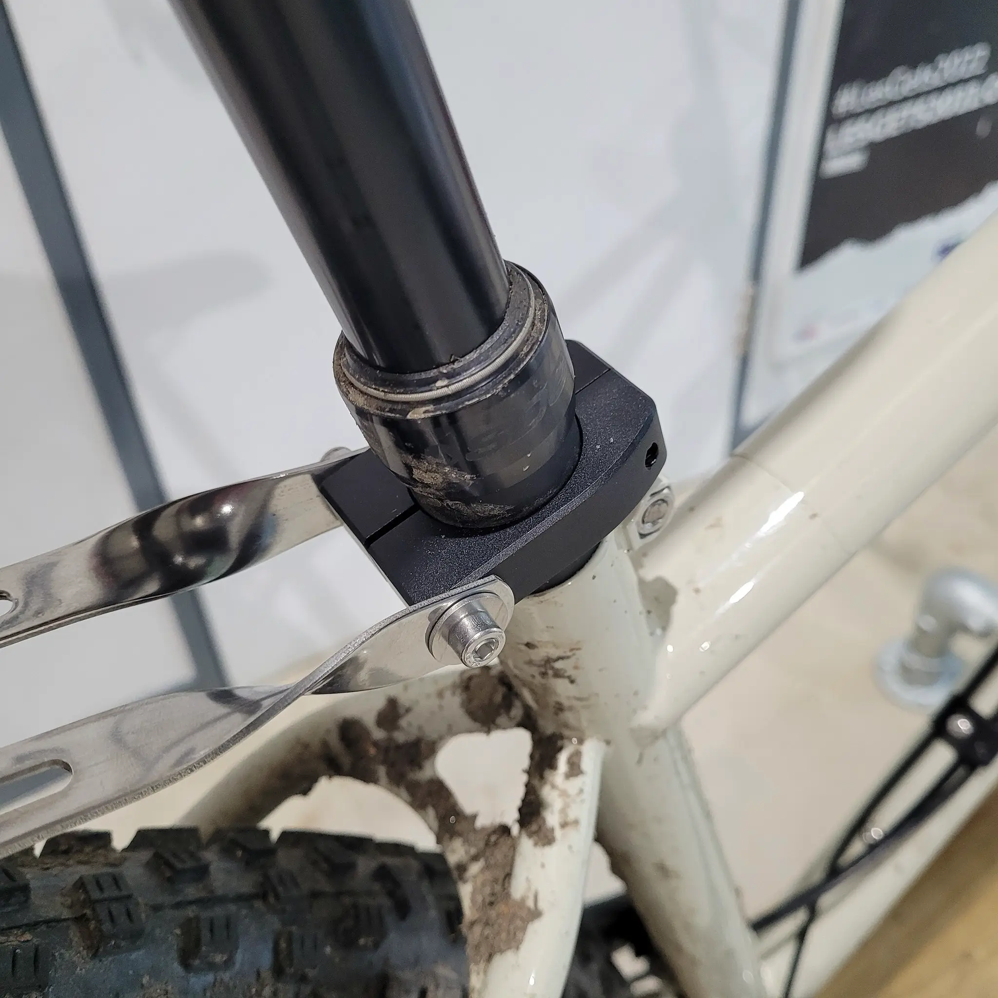 However for those of you that do want some luggage, we now have an option for you. It's a seatpost mounted adapter for 31-6 seatposts that clamps on and gives you the top mounting points in a good position, even on a smaller frame. Here's the adapter on our C2 Solaris demo bike (complete with mud from last demo, it's too cold to clean it at the moment!).